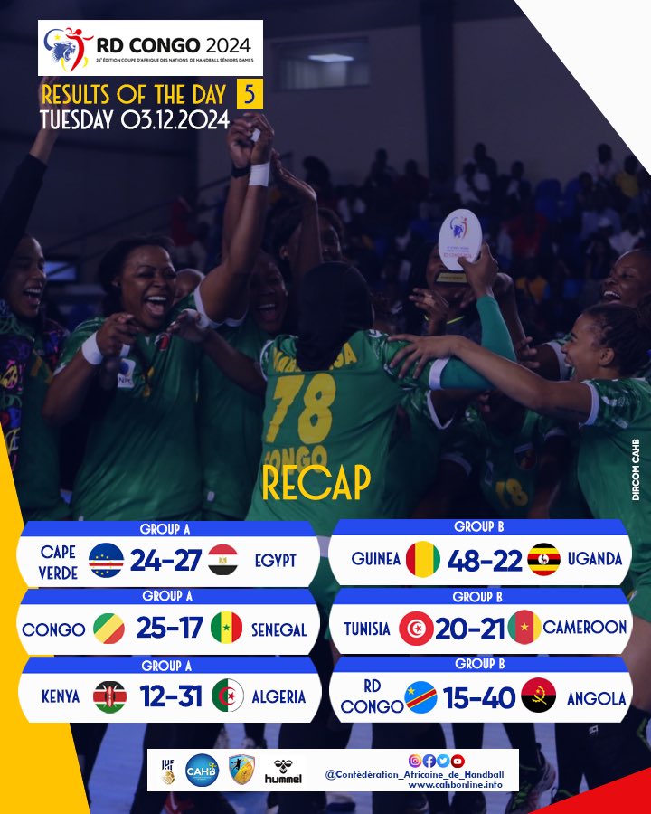 Le Cap Vert avait besoin d’une victoire pour garantir leur place en quarts de finale. Les Requins bleus Dames vont, cependant, courber l’échine devant l’Egypte (24-27), dans un match intense. L’Angola continue sa marche royale en dominant le pays hôte, la RDC (15-40). Le Cameroun va battre sur le fil la Tunisie (20-21).