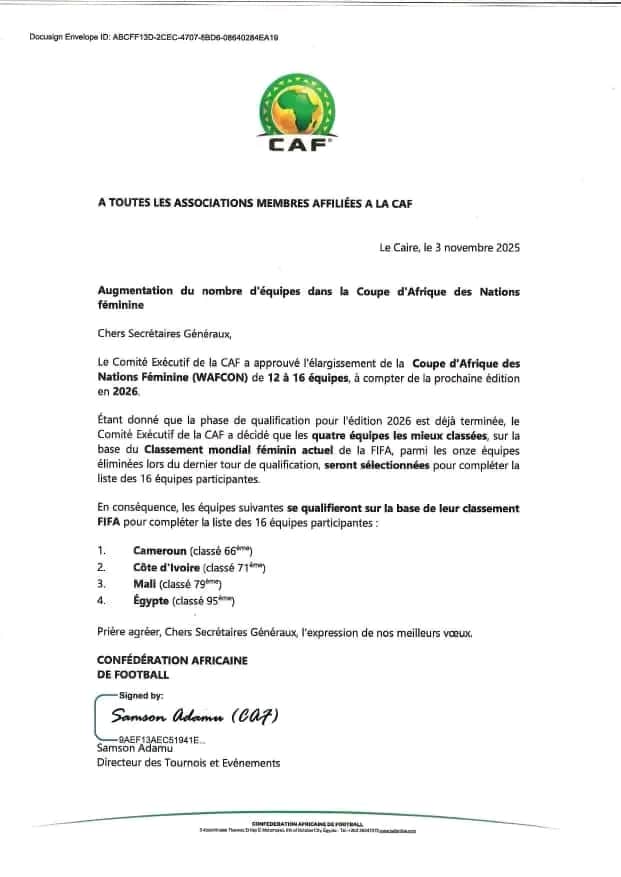 Ce repêchage, motivé par le niveau et le classement de ces équipes, permet de maintenir des acteurs historiques du football féminin africain dans la compétition, assurant un plateau plus relevé et une plus grande représentativité pour cette édition de la CAN Féminine 2026.